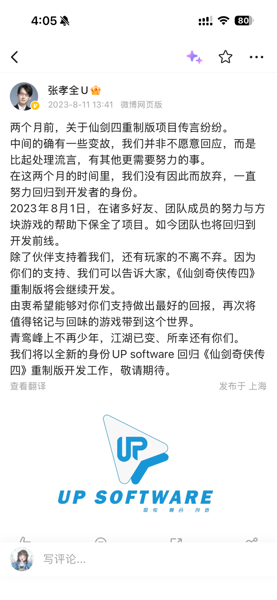 当年8月11日,张孝全在微博上做出了直接回应:项目在研发过程中,确实遇上了一些变故,因此在6月到8月的这两个月里,他们一直努力想要回到开发者身份,并在8月1日成功保全了项目。接下来,团队将以UP software的全新身份回归项目开发工作。