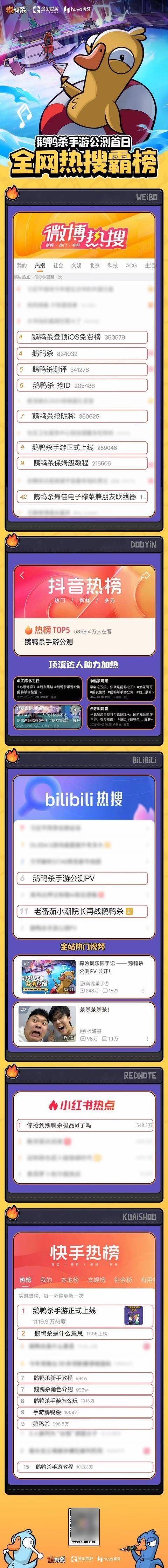 开服当天,“鹅鸭杀手游公测”“你抢到鹅鸭杀极品id了吗”等诸多话题,全天轮番登陆抖音、B站、微博、小红书等渠道热榜、热搜,成为开年首个“破圈”游戏爆款。