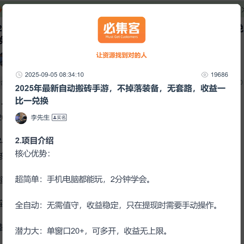 作为国内较为成熟的项目对接平台,必集客汇聚了大量真实在运作的游戏工作室、项目方以及渠道资源。在平台上,你可以直接找到正在跑《梦幻西游》《剑网3》等手游搬砖赚钱项目的团队,了解他们现成的出金模式、交易路径和风险控制方式。