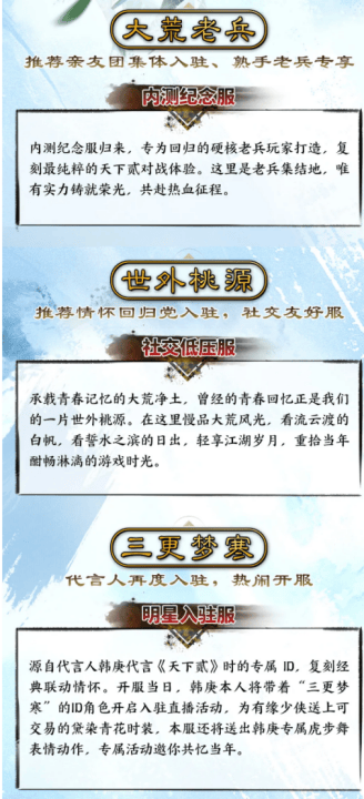 玩家数量这么多,会不会众口难调呢?没事儿!为了满足不同玩家的需求,这次公测开放三大服务器:“大荒老兵”主打经典PVP,适合热衷竞技的老玩家;“世外桃源”侧重轻松社交,适合和好友悠闲探索大荒风光;而“三更梦幻”不仅有机会邂逅代言人韩庚,还有机会获得可交易的珍稀时装“黛染青花”和专属表情“虎步舞”。不管你是哪种玩家,总有对你口味的服务器可以爽玩!