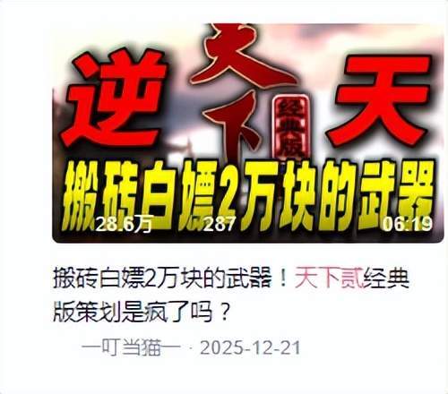 犹记得之前游戏测试期就有大佬靠搬砖狂赚2w的瓜还记得吗?老芒果、叮当猫这些游戏圈“老炮儿”都亲自下场,叮当猫直接搬出天域武器,这波操作直接让搬砖党集体“支棱”起来了。