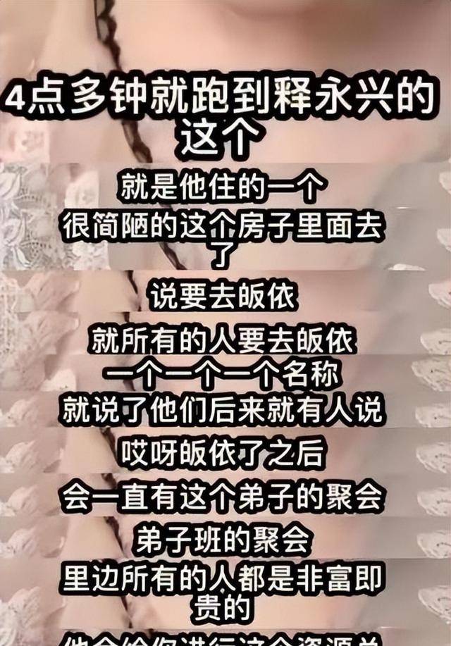 等领导们进屋,她在外面和当地工作人员闲聊,随口问起释永信的私生活,对方直接说他在郑州有房产,还供着女学生。