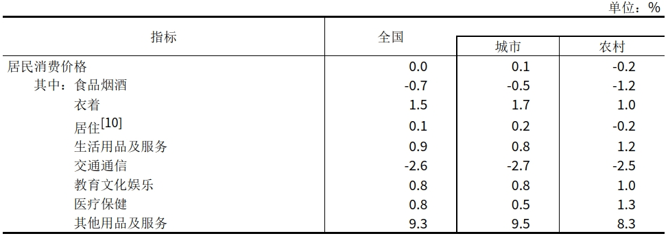 全年居民消费价格与上年持平。工业生产者出厂价格下降2.6%。工业生产者购进价格下降3.0%。农产品生产者价格[9]下降3.7%。12月份,70个大中城市中,新建商品住宅销售价格环比上涨的城市个数为6个,持平的为6个,下降的为58个;二手住宅销售价格环比下降的城市个数为70个;新建商品住宅销售价格同比上涨的城市个数为5个,下降的为65个;二手住宅销售价格同比下降的城市个数为70个。