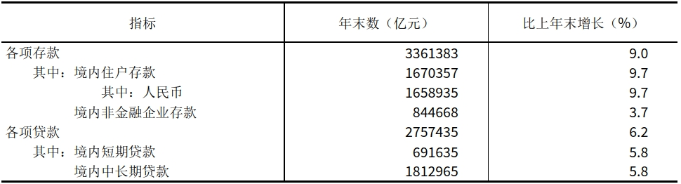 全年社会融资规模增量[54]35.6万亿元,按可比口径计算,比上年多3.3万亿元。年末社会融资规模存量[55]442.1万亿元,按可比口径计算,比上年末增长8.3%,其中对实体经济发放的人民币贷款余额268.4万亿元,增长6.3%。年末全部金融机构本外币各项存款余额336.1万亿元,比年初增加27.8万亿元,其中人民币各项存款余额328.6万亿元,增加26.4万亿元。全部金融机构本外币各项贷款余额275.7万亿元,增加16.2万亿元,其中人民币各项贷款余额271.9万亿元,增加16.3万亿元。人民币普惠小微贷款[56]余额36.6万亿元,增加3.6万亿元。本外币涉农贷款余额53.6万亿元,增加3.4万亿元;制造业中长期贷款余额14.9万亿元,增加1.0万亿元;绿色贷款余额44.8万亿元,增加7.7万亿元。全年全国新发放企业贷款加权平均利率[57]3.22%,比上年下降41个基点。
