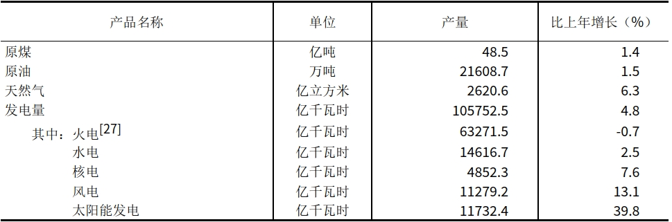 初步核算,全年能源消费总量61.7亿吨标准煤,比上年增长3.5%。煤炭消费量增长0.1%,原油消费量增长3.6%,天然气消费量增长2.0%,电力消费量增长5.0%。煤炭消费量占能源消费总量比重为51.4%,比上年下降1.8个百分点;天然气、水电、核电、风电、太阳能发电等清洁能源消费量占能源消费总量比重为30.4%,上升1.8个百分点。重点耗能工业企业单位电石综合能耗下降0.7%,单位合成氨综合能耗下降2.3%,吨钢综合能耗上升1.9%,单位电解铝综合能耗下降0.9%,每千瓦时火力发电标准煤耗与上年持平。初步测算,扣除原料用能和非化石能源消费量后,全国万元国内生产总值能耗[88]比上年下降5.1%。全国碳排放权交易市场碳排放配额[89]成交量2.35亿吨,成交额146.3亿元。