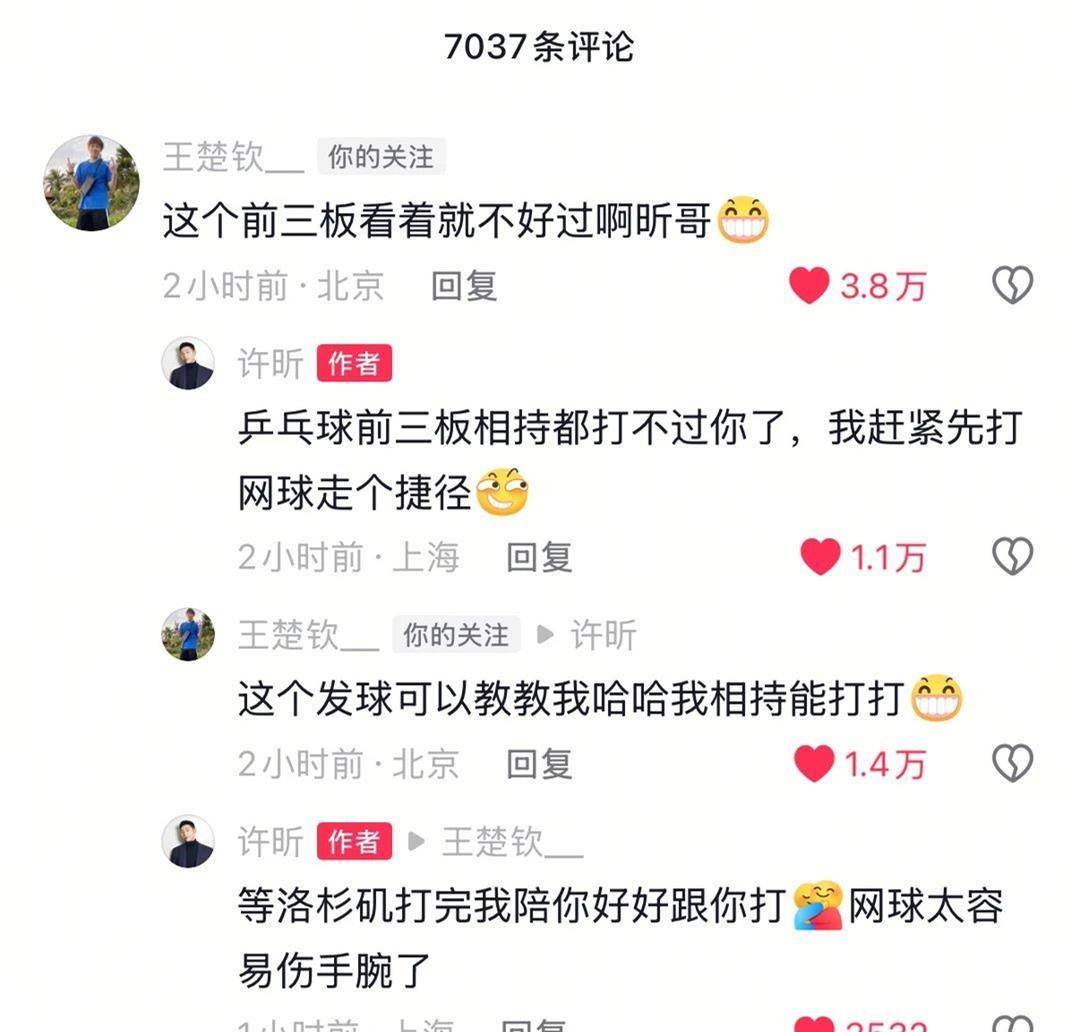 就在林诗栋退赛引发热议的同一天,另一条轻松有趣的互动冲淡了紧张气氛。 已经淡出赛场的“人民艺术家”许昕,在社交平台发布了自己打网球的视频。 令人没想到的是,被称为“5G冲浪选手”的王楚钦迅速现身评论区,他用乒乓球的专业术语调侃道:“这个前三板看着就不好过啊昕哥! ” 许昕的回复则充满了自嘲和幽默:“乒乓球前三板相持都打不过你了,我赶紧先打网球走个捷径。 ”