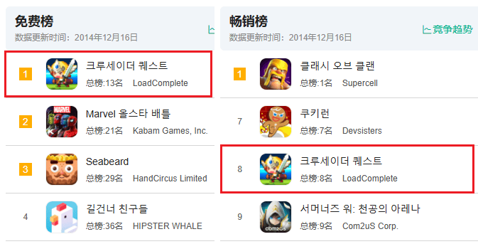 这款游戏在2014年底在韩国和全球多个市场上线,并光速冲进游戏畅销榜Top 8,跟《姜饼人》和《魔灵召唤》坐一桌。