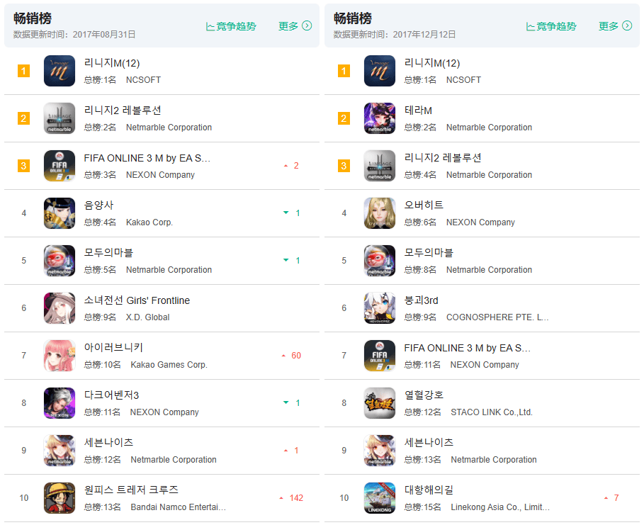 翻看当时的韩国iOS游戏畅销榜,原因不难找,大体分为两方面。一是韩国游戏大IP下场,各种IP改编的手游大作崛起,快速占领市场头部。