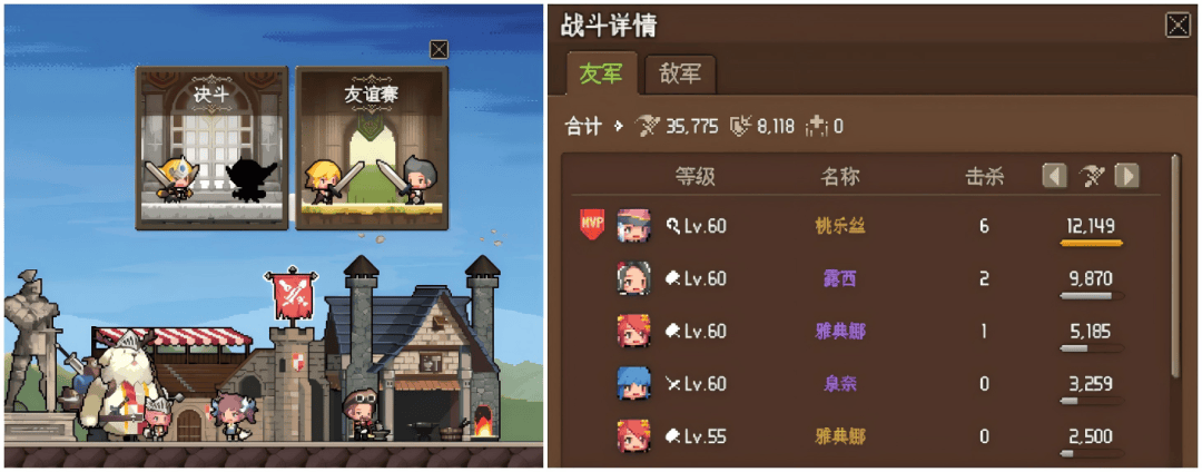 竞技场则采用最经典的异步PVP模式,玩家挑战的都是其他玩家的镜像,分为三人小队战和多队上场的大团战。两种模式下各个勇者的发挥也有差别,于是培养不同勇者的理由又多了一个。