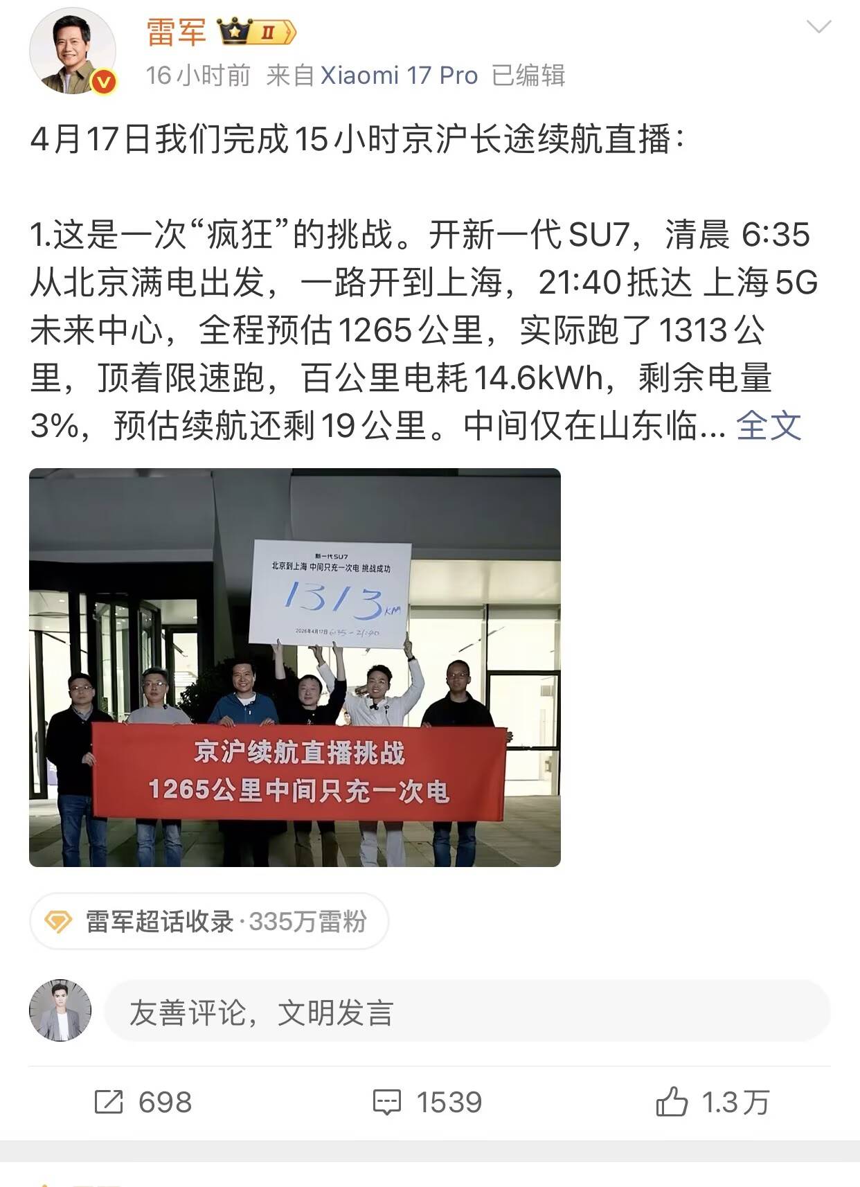 他们从北京出发,目的地是上海,全程高速1265公里、雷军全程透明直播,就为给大家证明和展示,真实路况、真实电耗、真实数据。