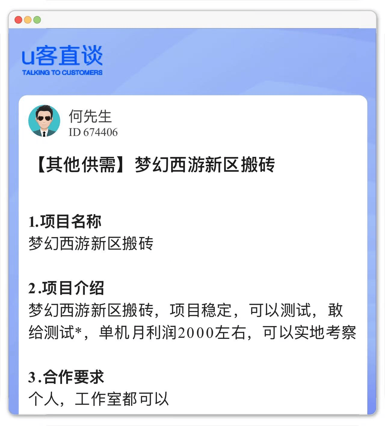 而想摸清工作室的动向,国内规模领先的游戏搬砖工作室招商平台 “U 客直谈” 就是块 “试金石”。上面全是工作室实打实的招商需求和资源动态,哪款游戏有人批量招人、哪款在囤账号,一看便知深浅,比瞎看广告靠谱十倍。